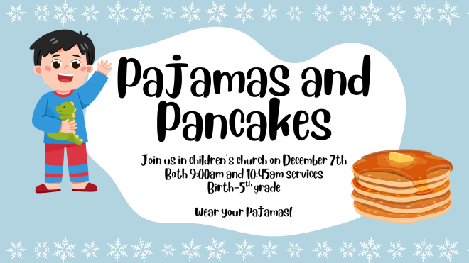 It's wear-your-pajamas-to-church day! At both services on December 7th (9am & 10:45am), we will have pancakes in kids ministry, for birth-5th grade. Join us on Sunday morning!