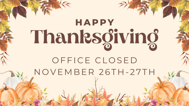 The church office will be closed from November 26th-27th (Wednesday-Thursday) for Thanksgiving. There will be no youth group on the 26th. Have a wonderful weekend, church!