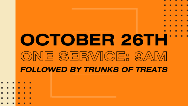 On October 26th, we will only have one service at 9am, followed by our Trunks of Treats event. Children's ministry will be for birth-K; elementary students will be in service...