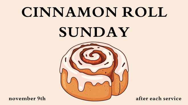 Baked goods and friendly faces... Stay after each service for a cinnamon roll and a time of fellowship with your church family! Join us on Sunday the 9th, at 9am & 10:45am.