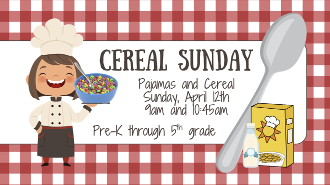 On Sunday, April 12th, all of our pre-K through 5th grade classes get cereal! Wear your favorite pajamas, invite a friend, and join us at 9am and 10:45am.